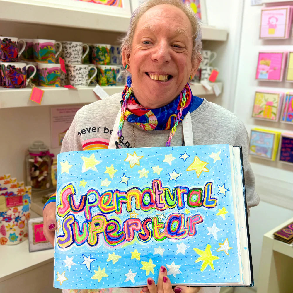 25g grams of pocket-sized deliciousness, presented in a recyclable paper envelope that features Stephen Thomson's bright and beautiful 'Supernatural Superstar' design and is finished with a shimmering blue foiled frame. A perfect gift for any chocoholics, art fans and good-cause supporters everywhere!