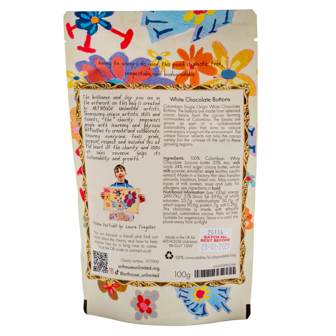Creamy and moreish silky white chocolate buttons with notes of vanilla presented in a bag decorated with positive affirmations.