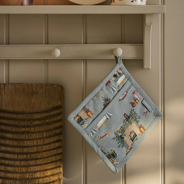 Add festive flair to your kitchen with this charming pot grab, featuring nostalgic Christmas scenes hand-drawn in Sophie’s signature style. Set against a soft dusty blue background, the illustrations capture twinkling trees, roaring fires, and festive woodland friends. Crafted from cotton with an internal thermal lining for heat protection, it’s ideal for safely handling hot pans or serving up Christmas lunch in seasonal style..