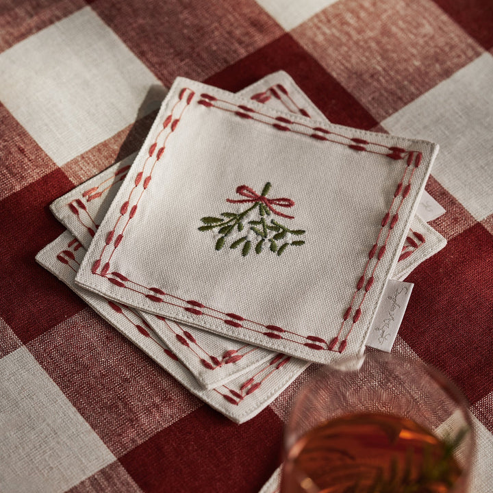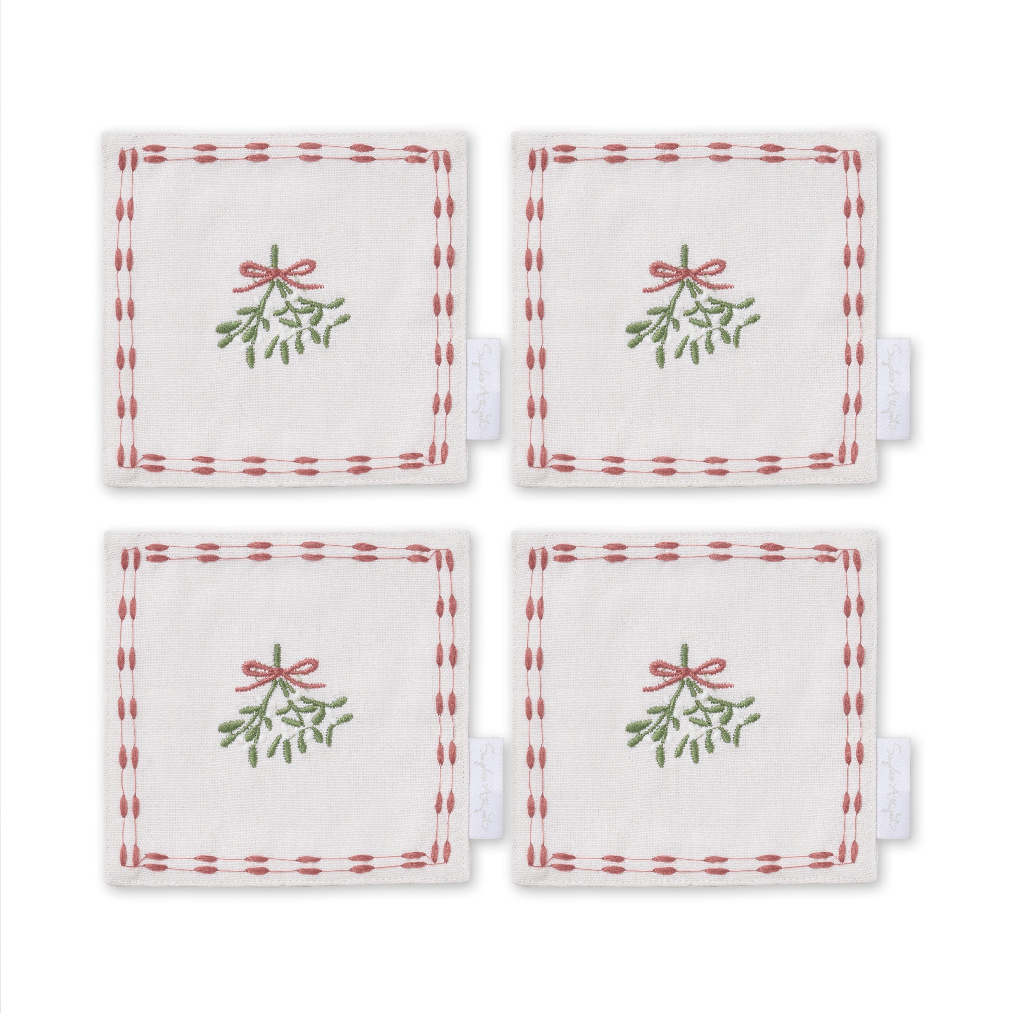 These delicate embroidered drink napkins feature Sophie’s graceful mistletoe sprigs, each tied with a little red bow. Perfect for seasonal entertaining, they’re a lovely way to serve festive drinks, adding an elegant touch to any table setting. Made from cotton, these coasters come as a set of 4.