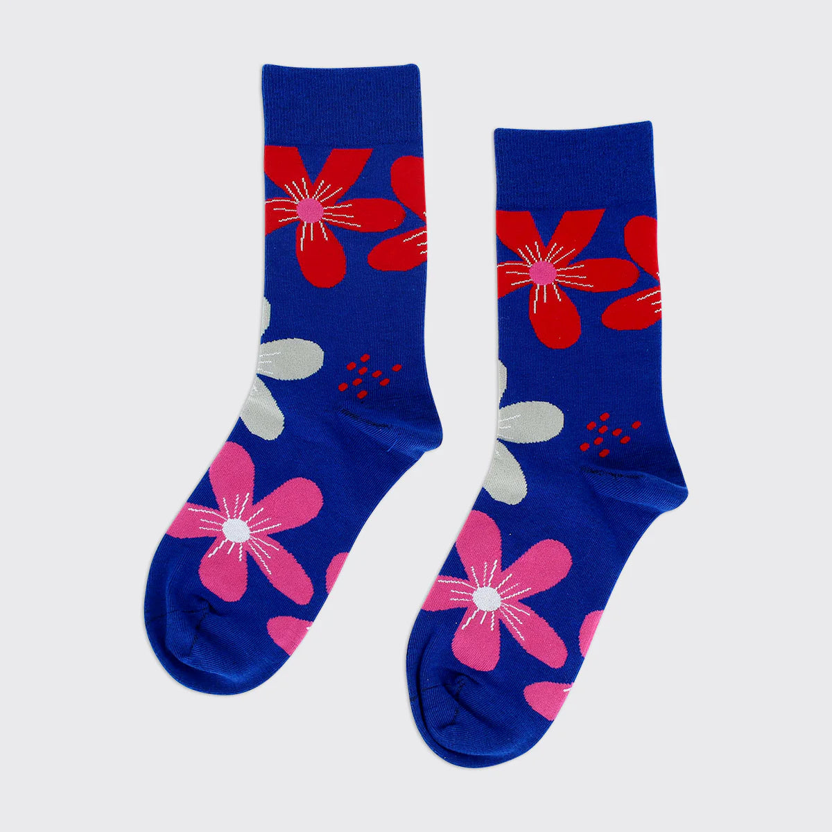Striking socks with an abstract flower design. Deep pink and grey blooms sit on a navy blue background with contrast toes and heels.