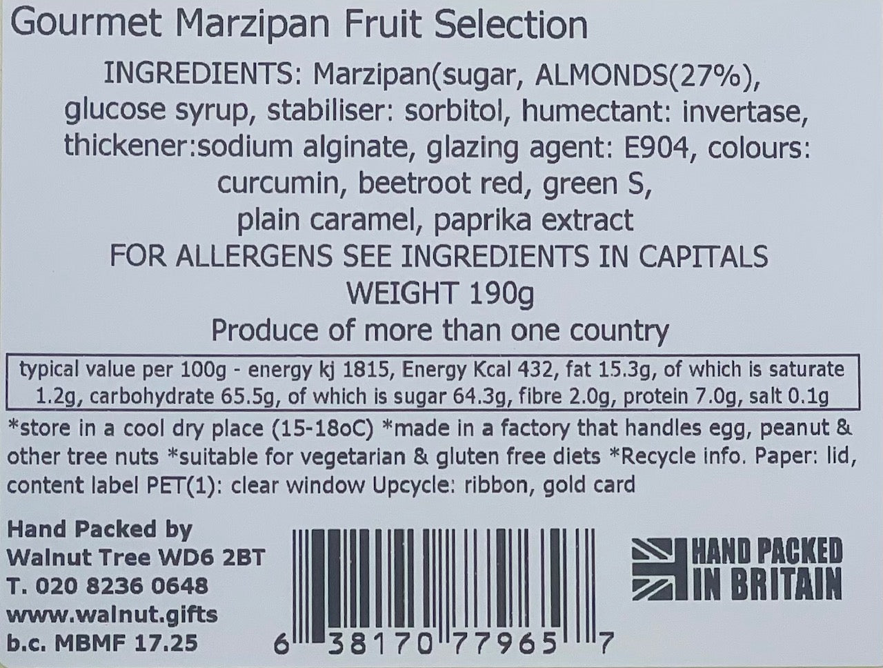 Celebrate the festive season with this Medium Marzipan Fruit Box, featuring 190g of beautifully shaped marzipan sweets. Each piece captures the rich almond flavor and vibrant colors of classic fruits, making them an elegant and tasty addition to holiday gatherings or a thoughtful gift to share the joy of the season.