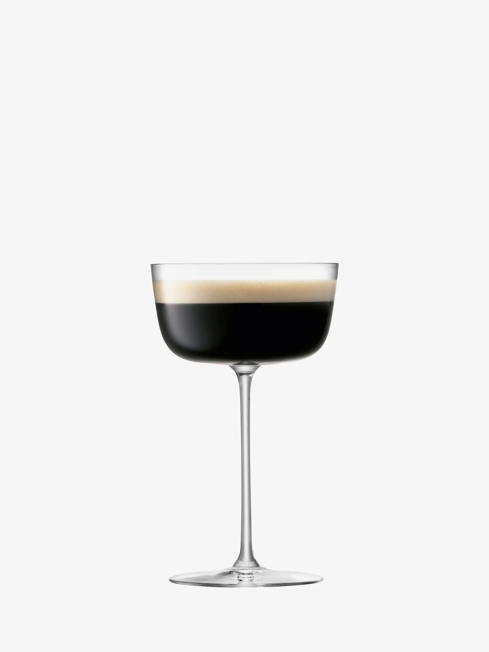 Set of four cocktail saucers with wide, flared bowls and fine straight stems. Designed for martini cocktails or champagne. Made from lead-free crystalline glass for clarity and strength.