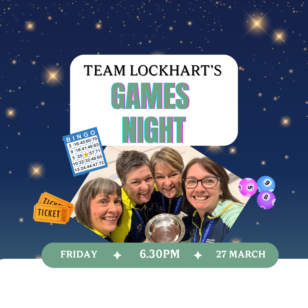 Join us for a fun-filled Games Night in support of Team Lockhart, who, after winning the Scottish Senior Women’s Curling Championships, will go on to represent Scotland at the World Senior Curling Championships in Geneva, where they’ll be bidding to retain their World Championship title.